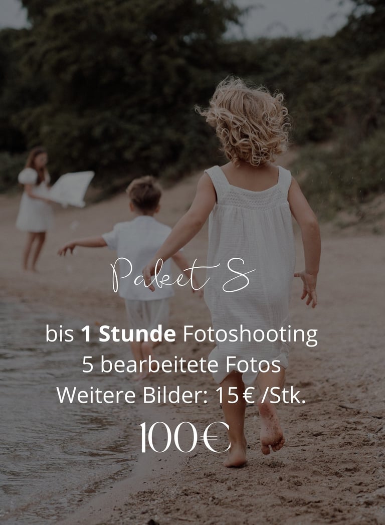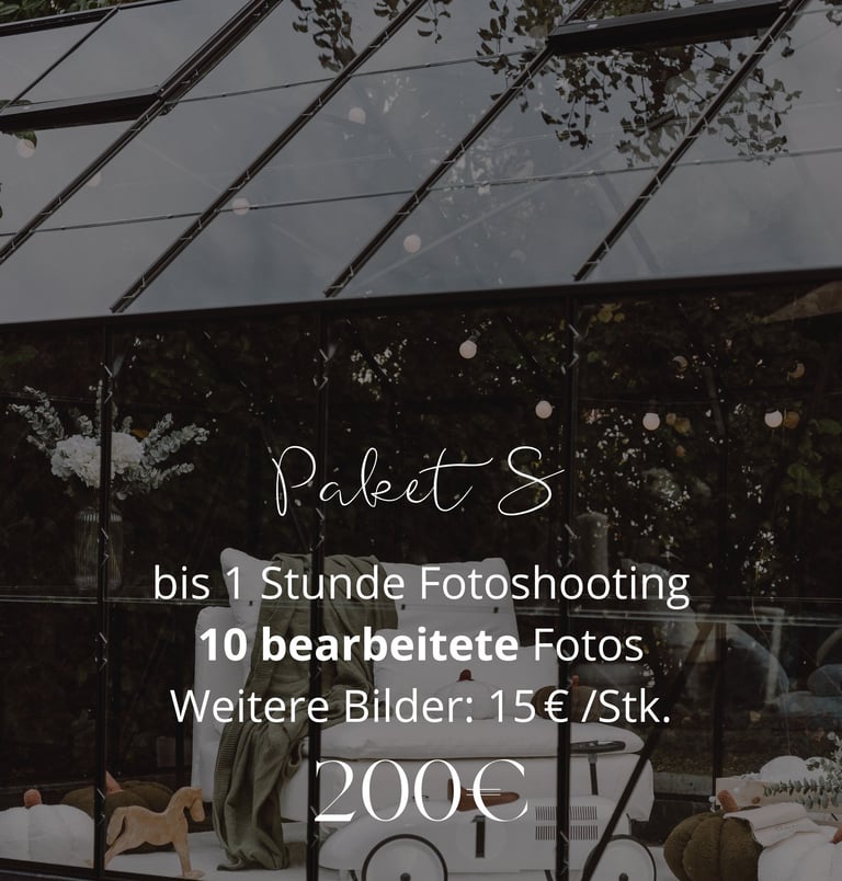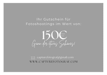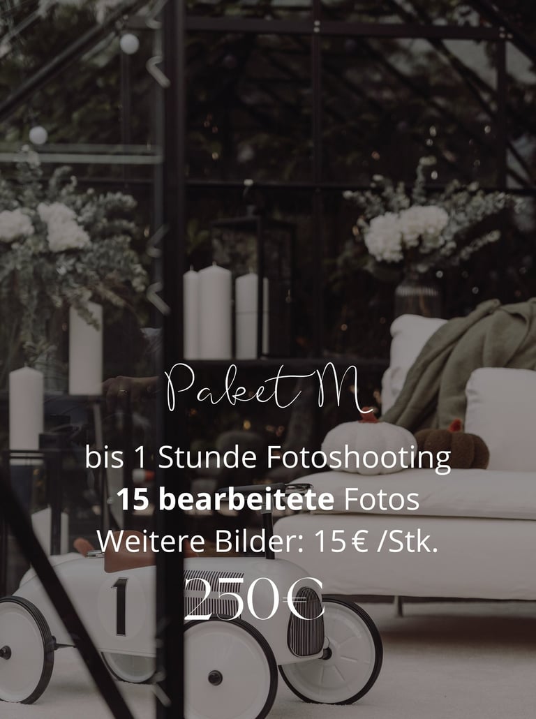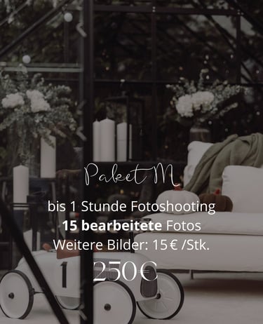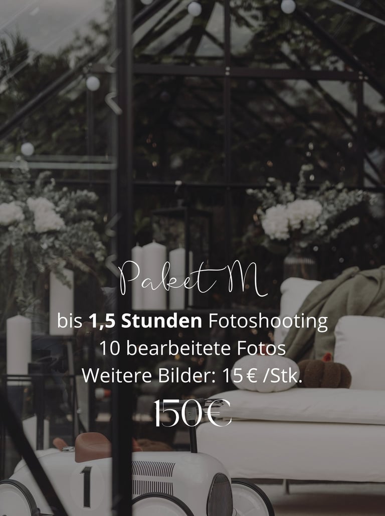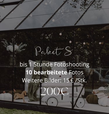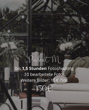 Der Preis für das Fotoshooting umfasst die gemeinsame Vorbereitung und Besprechung aller Details vor dem Termin, damit das Shooting genau nach Ihren Wünschen abläuft. Während des Shootings erstelle ich die Fotos entsprechend dem gewählten Paket.