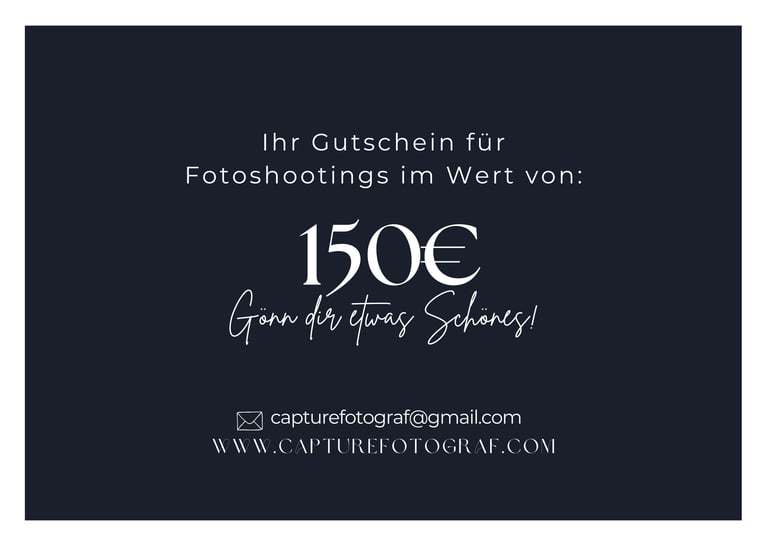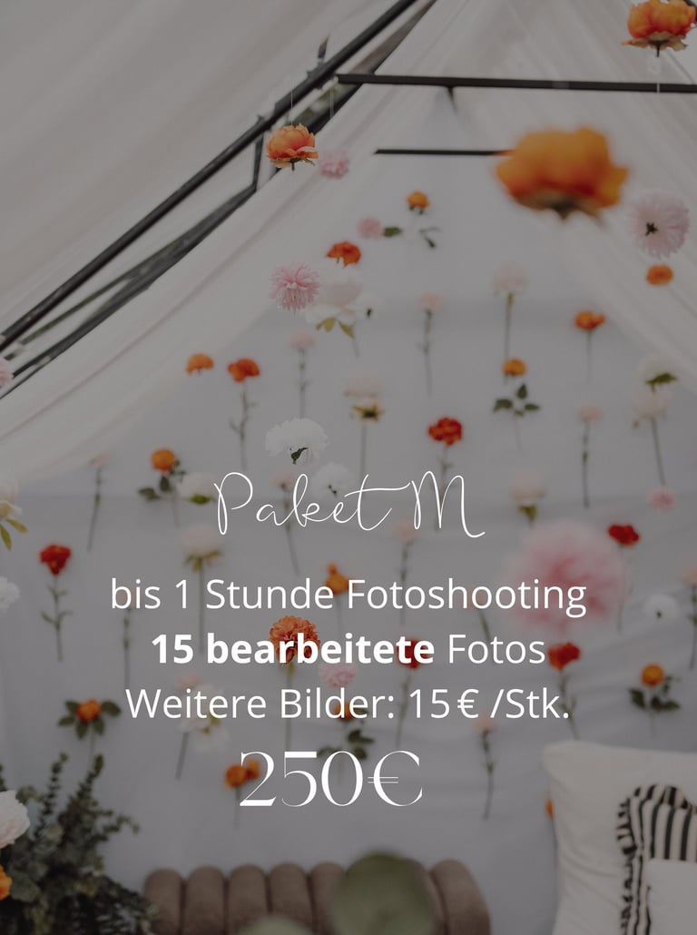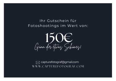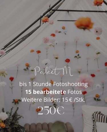 Der Preis für das Fotoshooting umfasst die gemeinsame Vorbereitung und Besprechung aller Details vor dem Termin, damit das Shooting genau nach Ihren Wünschen abläuft. Während des Shootings erstelle ich die Fotos entsprechend dem gewählten Paket.